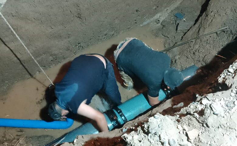 Es así que tras una extensa jornada de trabajo, los operarios de la empresa lograron reparar con éxito la rotura en el acueducto principal ubicado en calle Mascardi, cerca de Damas Patricias.