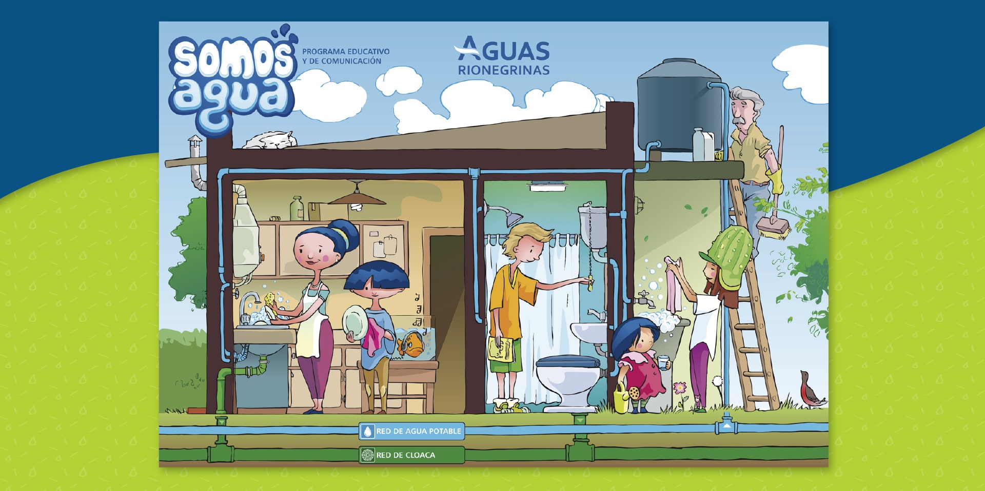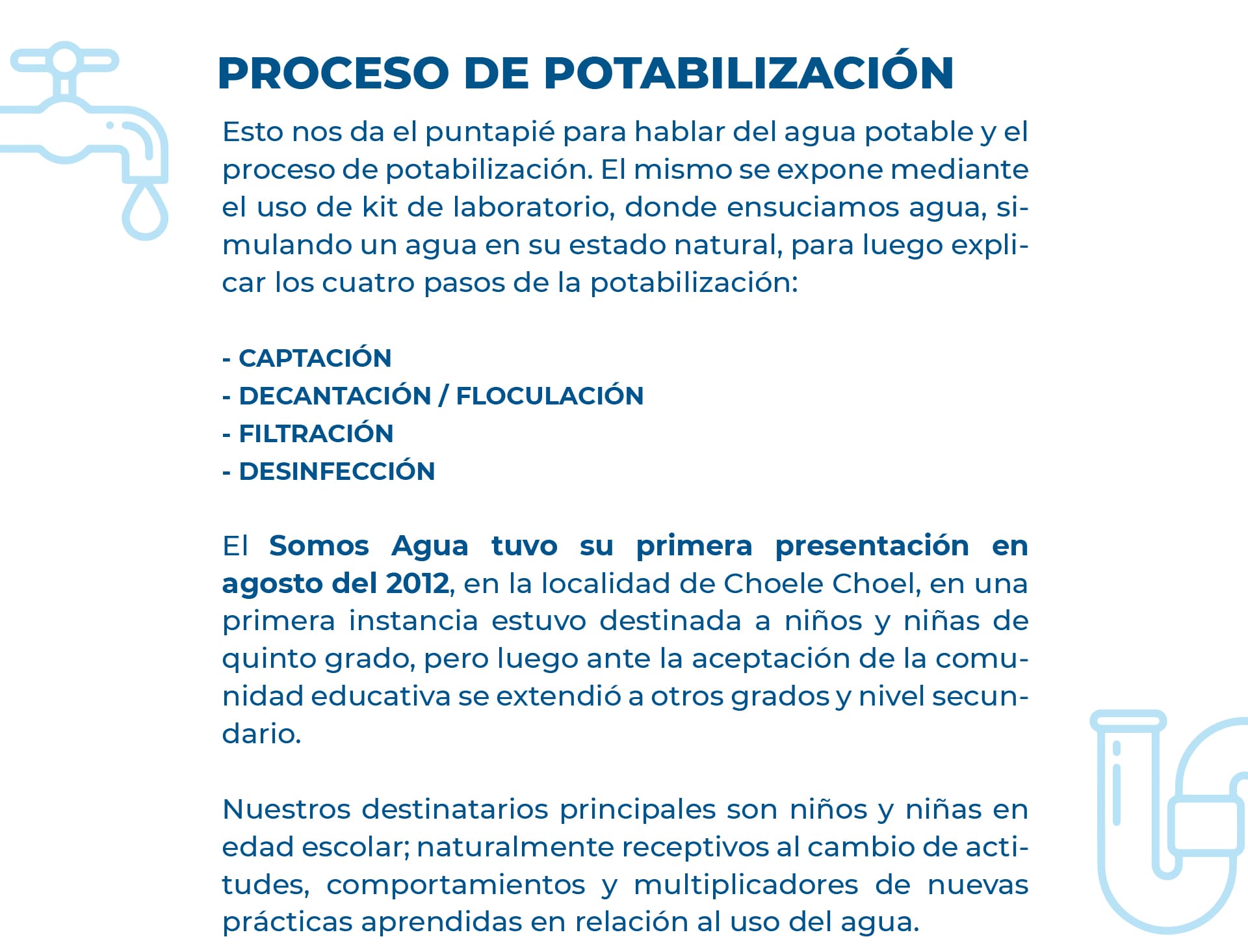 Somos Agua tiene la modalidad de charla/taller, donde el objetivo principal es conocer el AGUA: cantidad y disponibilidad de agua en el mundo, diferencia entre agua salada y dulce, la escasez del agua dulce en el mundo, las fuentes naturales de agua dulce en la provincia de Río Negro y cómo es su potabilización según la zona de residencia; usos del agua dulce; el agua como alimento, importancia de su consumo.