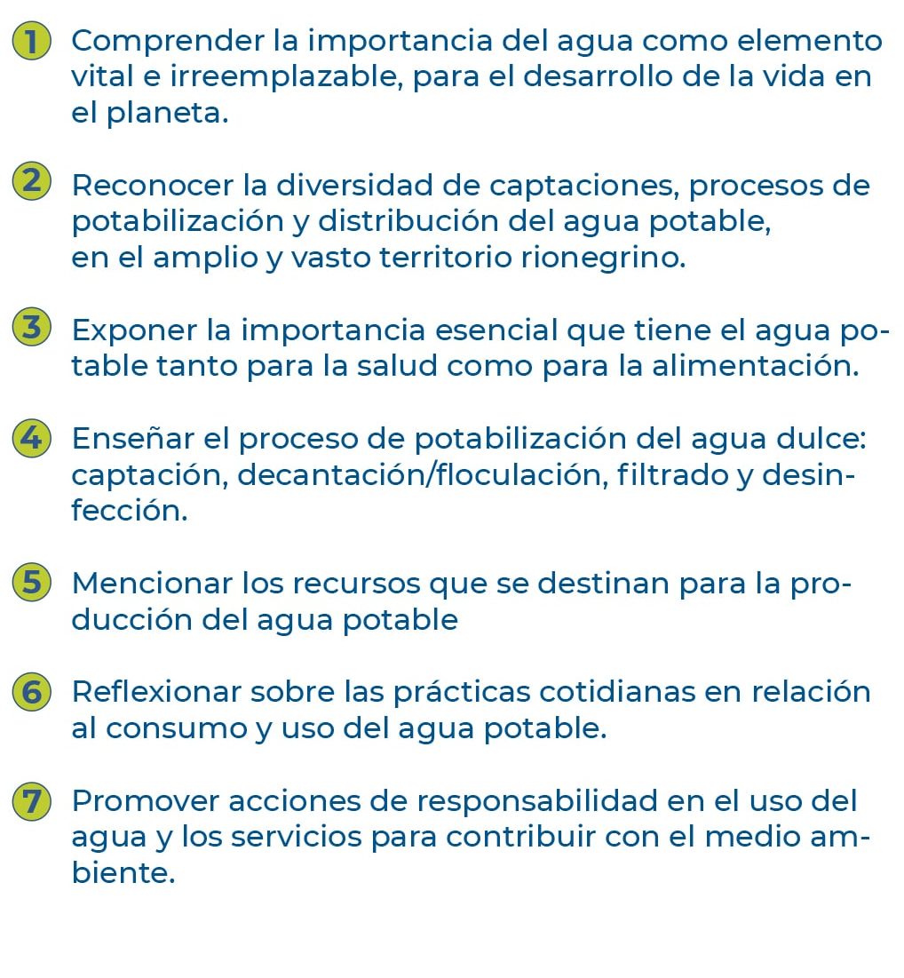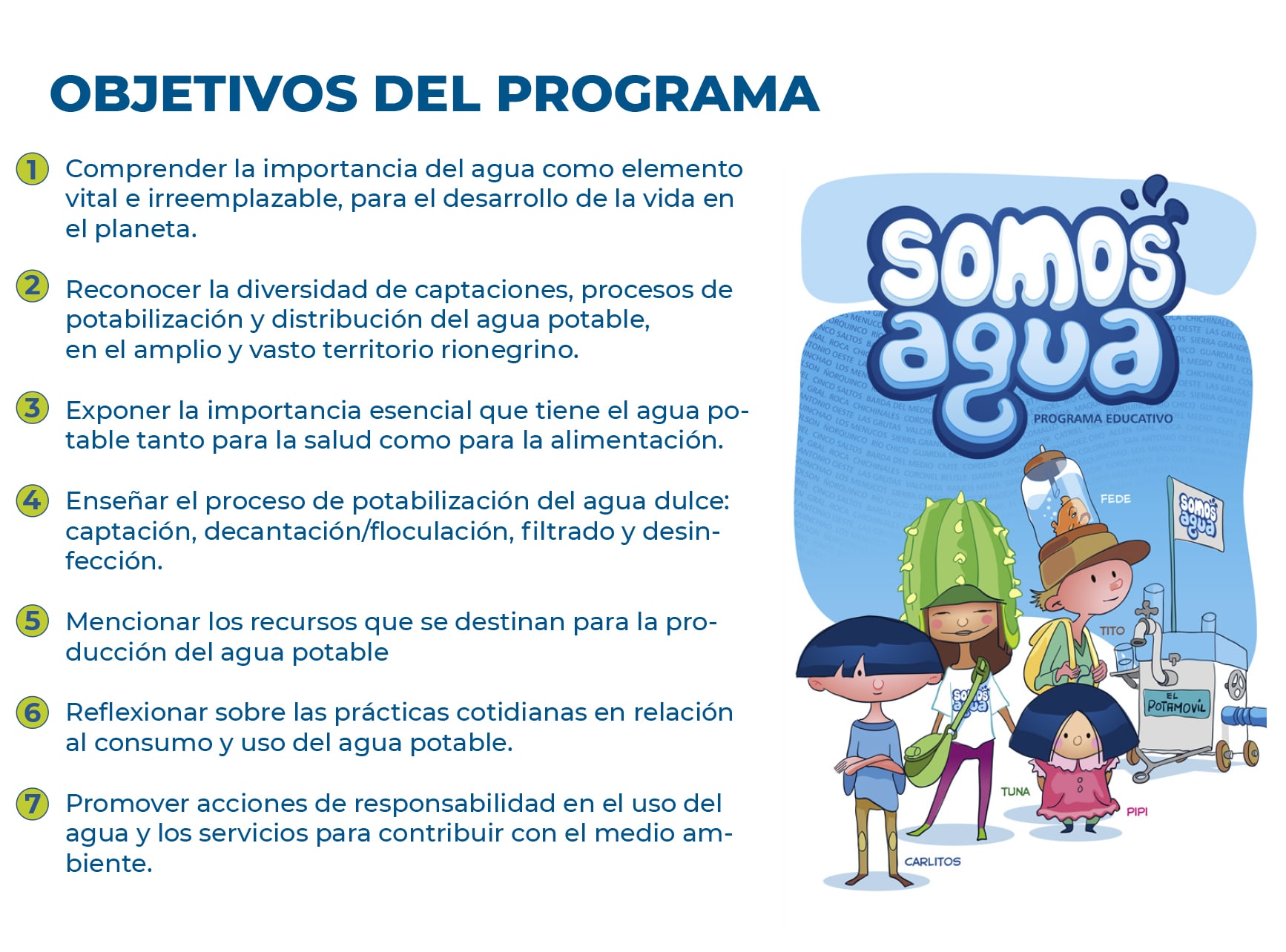 Somos Agua tiene la modalidad de charla/taller, donde el objetivo principal es conocer el AGUA: cantidad y disponibilidad de agua en el mundo, diferencia entre agua salada y dulce, la escasez del agua dulce en el mundo, las fuentes naturales de agua dulce en la provincia de Río Negro y cómo es su potabilización según la zona de residencia; usos del agua dulce; el agua como alimento, importancia de su consumo.